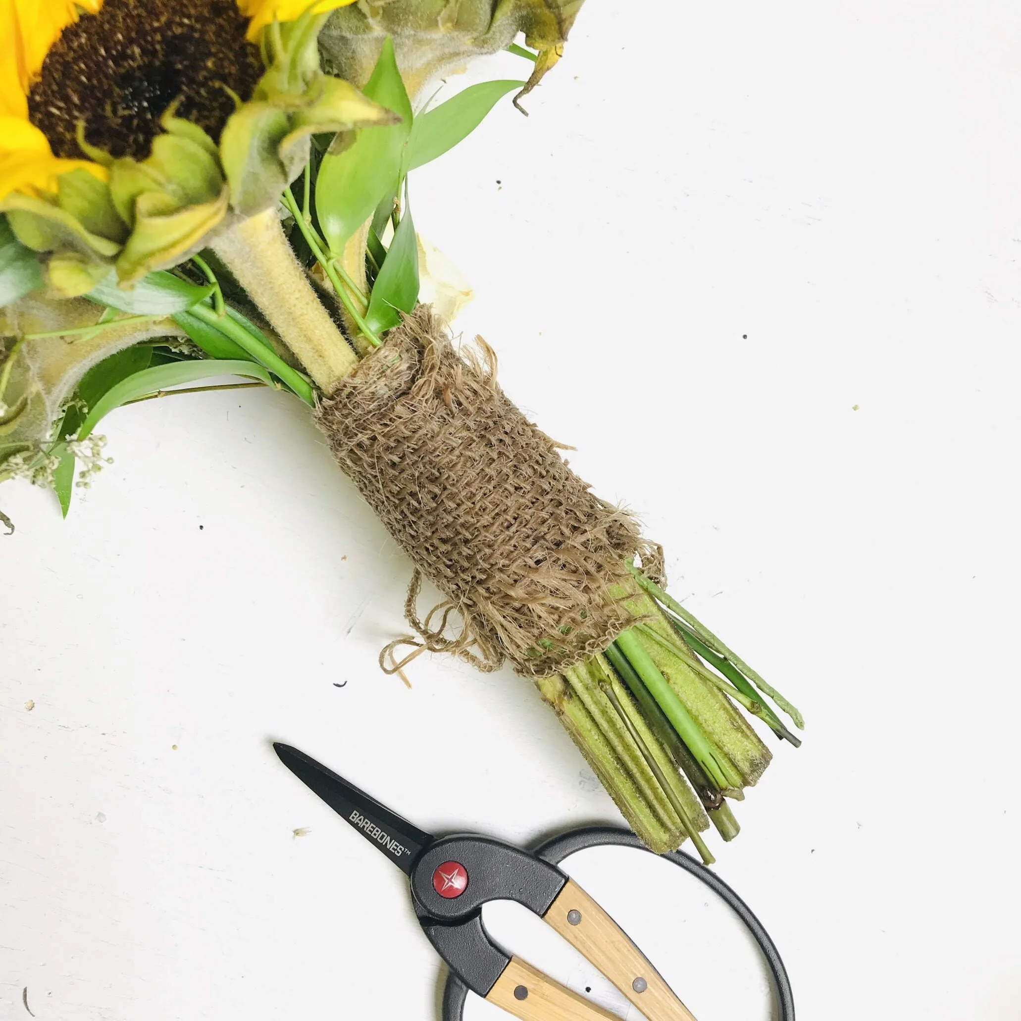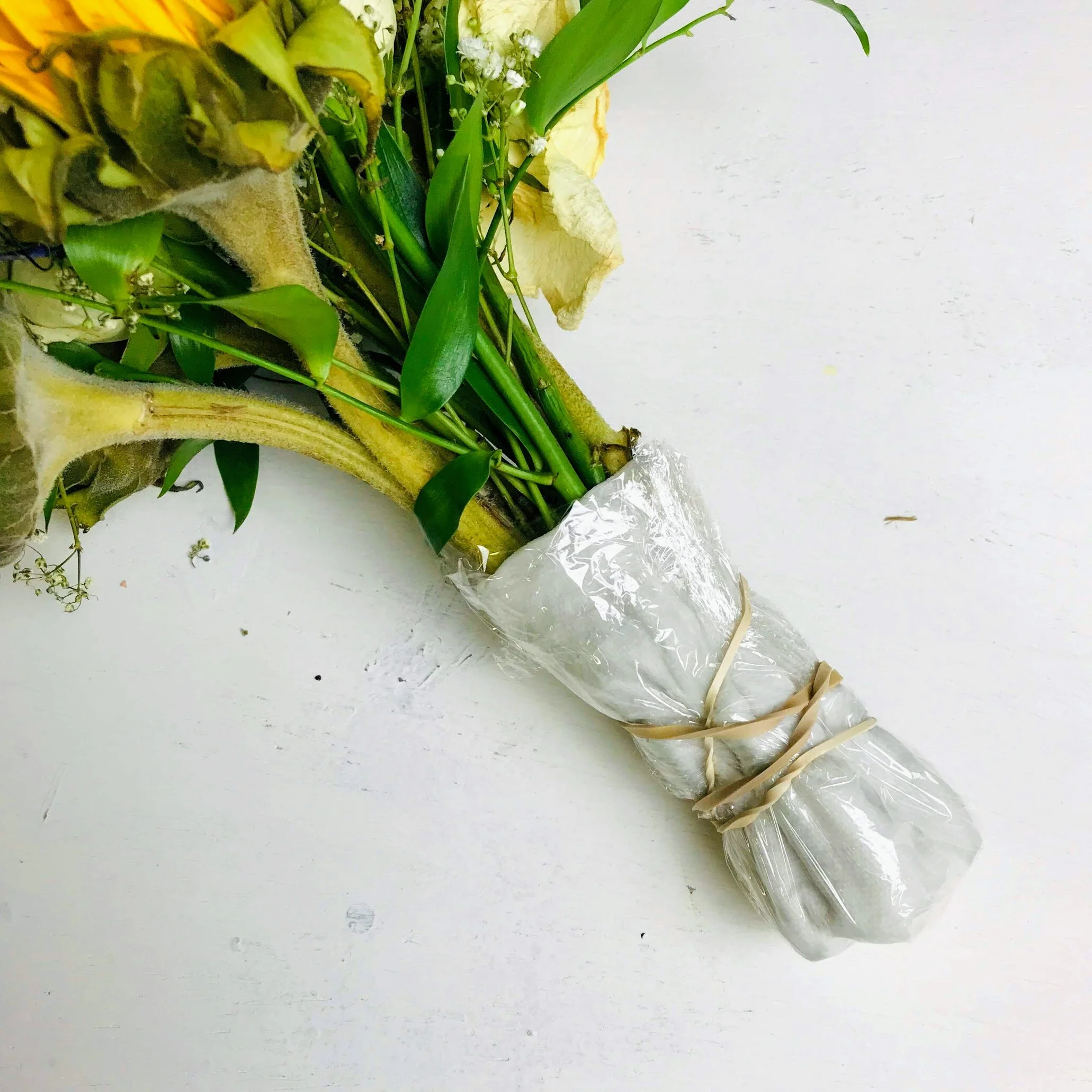 If you have large blooms or especially fragile flowers, consider putting floral tubes (available online or from a florist) with water on the bottom of those stems. Make sure to tape the tubes tightly around the stem so that the water doesn’t leak out.
