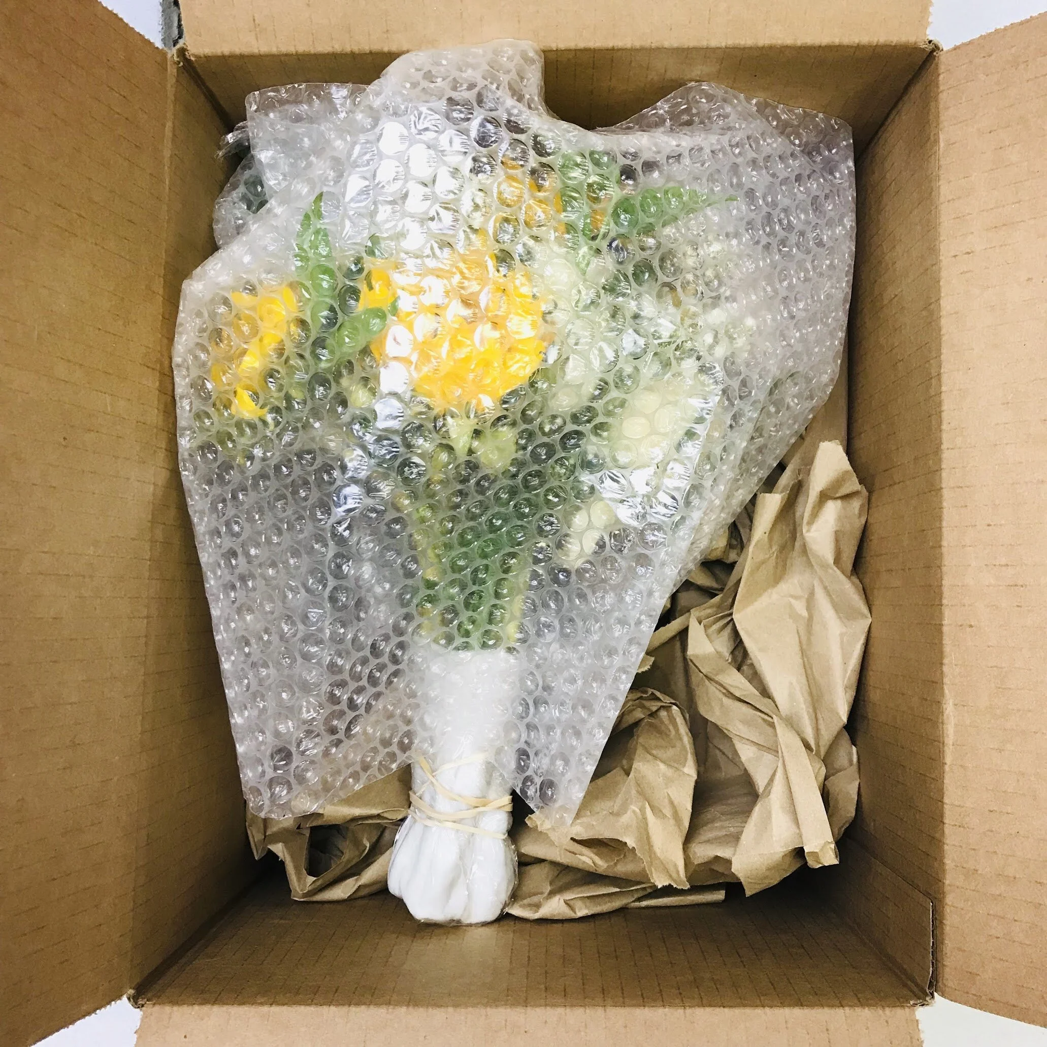 Fill the rest of the box with packing peanuts so that no movement can occur but not so much that the flowers get crushed. Include your confirmation email on the top.